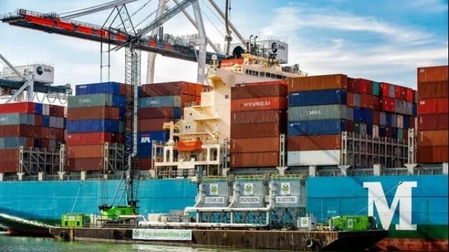 Clean Air Engineering Maritime has been providing services at the Port of Los Angeles, California, since 2015, when it became the first company to receive CARB approval for a barge-based marine exhaust treatment system that captures and treats air pollutants exhausted from the ship’s stack. The company’s system, which is based on barges that a positioned alongside and attached to the funnel, is currently the only exhaust capture and treatment service in compliance with the CARB At-Beth Regulation. They have serviced over 400 vessels, focusing currently mostly on containerships,