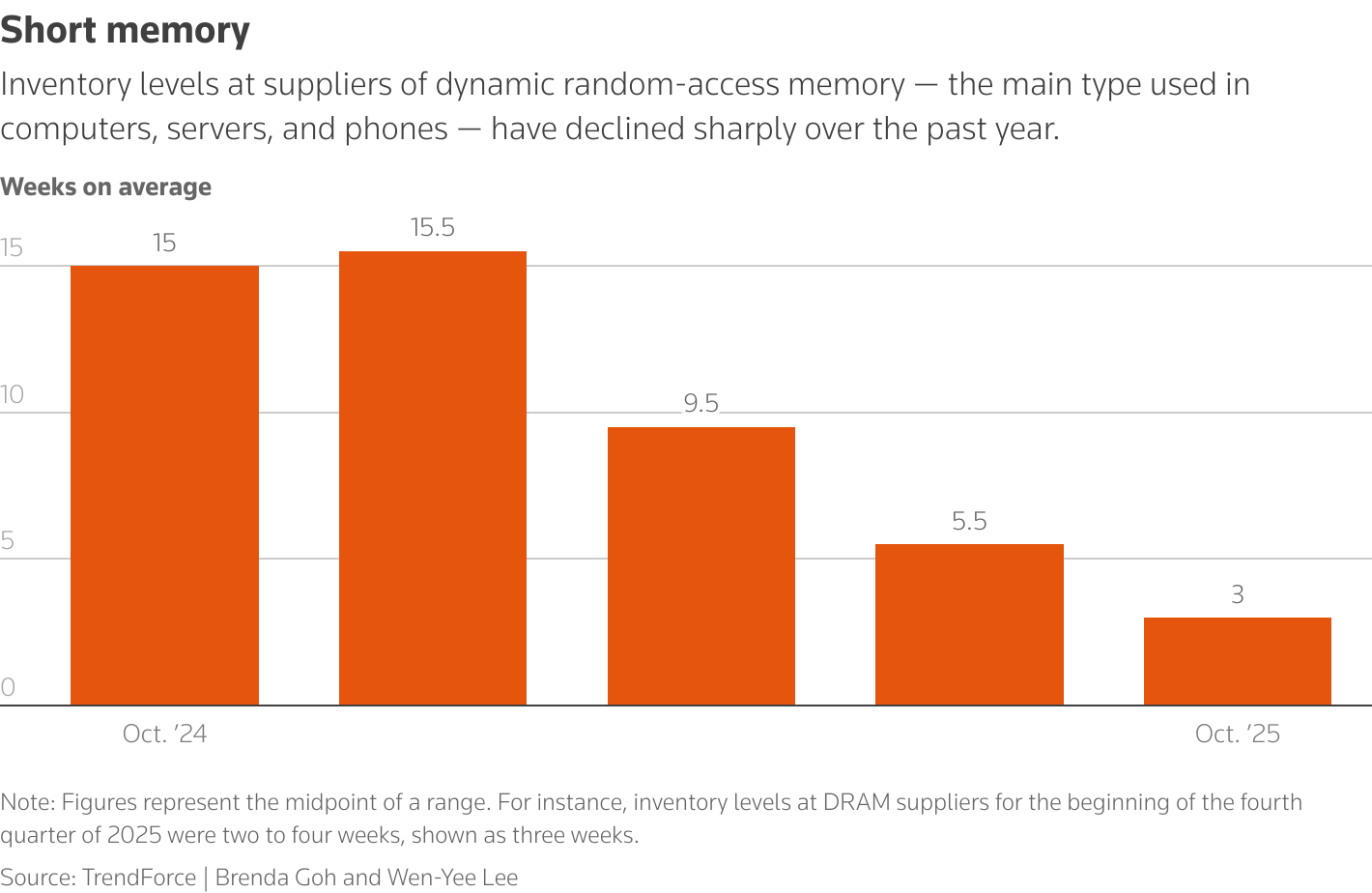 This Reuters examination of the spiraling supply crisis is based on interviews with almost 40 people, including 17 executives at chipmakers and distributors. It shows industry efforts to meet voracious appetite for advanced chips — driven by Nvidia and tech giants like Google, Microsoft and Alibaba — created a dual bind: Chipmakers still can’t produce enough high-end semiconductors for the AI race, yet their tilt away from traditional memory products is choking supply to smartphones, PCs and consumer electronics. Some are now hurrying to course-correct. Details of the global scramble by tech firms and price increases described by electronics retailers and component suppliers in China and Japan are reported here for the first time. Average inventory levels at suppliers of dynamic random-access memory (DRAM) — the main type used in computers and phones — fell to two to four weeks in October from three to eight weeks in July and 13 to 17 weeks in late 2024, according to TrendForce.